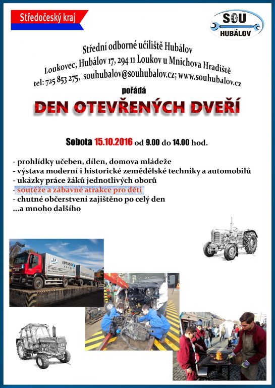 V sobotu 15.října 2016 se uskuteční v areálu SOU Hubálov tradiční "Den otevřených dveří 2016". Od 9 do 14 hodin bude umožněna zájemcům prohlídka školy, dílen, domova mládeže a školní jídelny. V dílnách jsou připraveny ukázky práce odborného výcviku žáků. Na dílenském dvoře bude vystavena moderní i historická zemědělská technika. Pro děti budou připraveny znalostní a dovednostní soutěže, střelba lukem a ze vzduchovky, jízda na koni a traktorem. Občerstvení ve školní jídelně a na dílenském dvoře bude poskytováno po celý den. Zájemcům o informace o studiu bude k dispozici ředitel školy v klubovně na domově mládeže.
