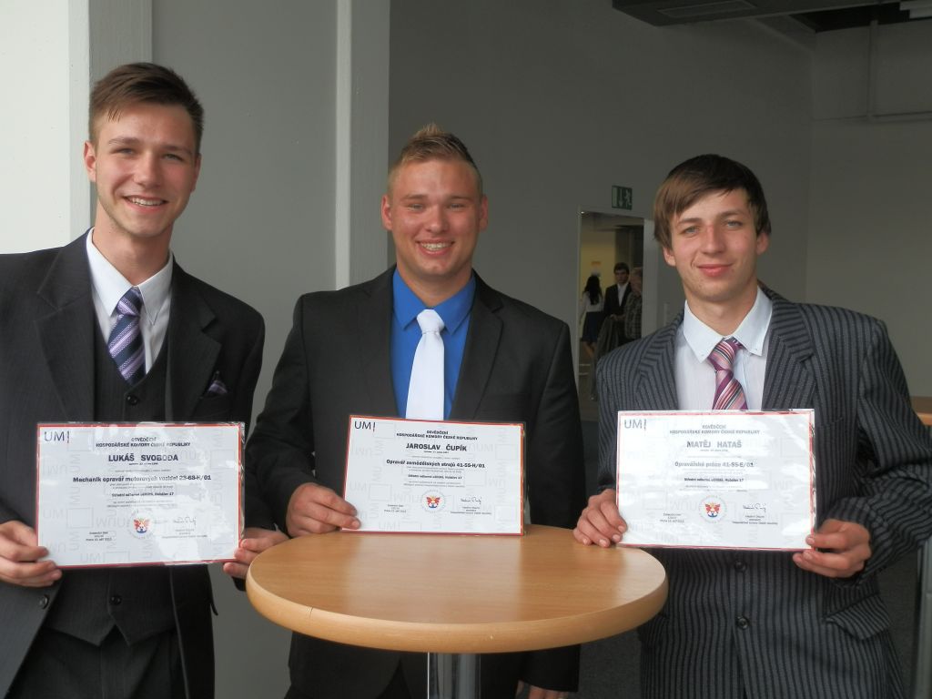 Na slavnostní akci konané dne 15.9.2015 u příležitosti Mezinárodního strojírenského veletrhu v Brně obdrželi Osvědčení Hospodářské komory ČR naši úspěšní absolventi tříletých oborů vzdělání s výučním listem Jaroslav Čupík (Opravář zemědělských strojů), Lukáš Svoboda (Automechanik) a Matěj Hataš (Opravářské práce). Blahopřejeme!