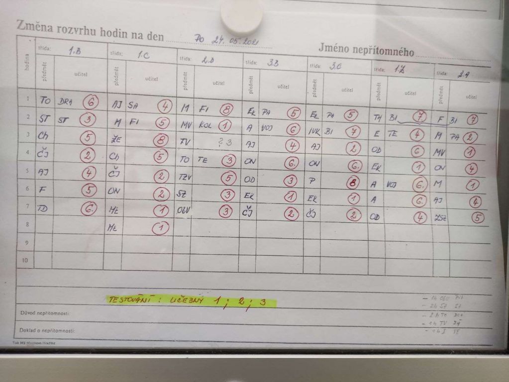 Od pondělí 24.května 2021 bude v plném rozsahu obnovena prezenční forma teoretické výuky. Každý den bude zveřejněn aktuální rozvrh hodin na příslušné informační tabuli. Pondělní rozvrh výuky v jednotlivých učebnách je uveden na přiložené fotografii. Všichni žáci před zahájením výuky musí projít testováním antigenními testy v učebně 1,2,3.