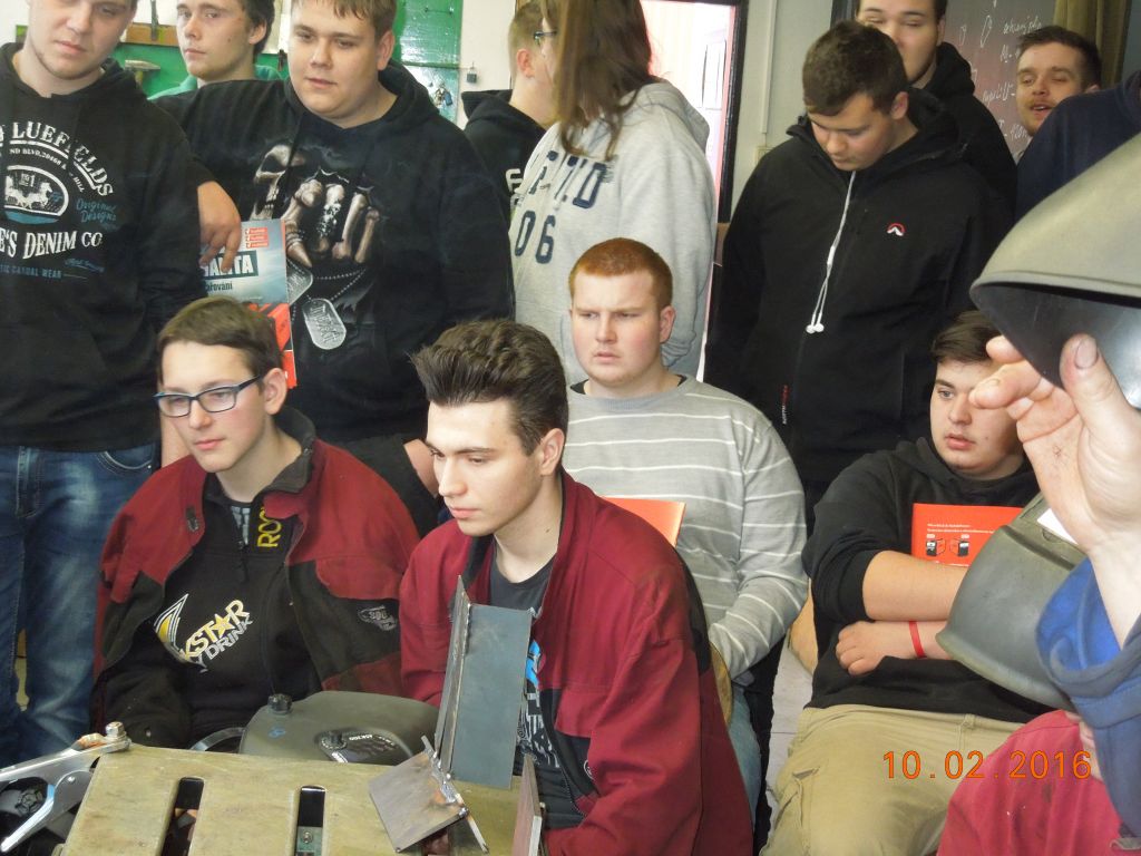V úterý 9.února 2016 proběhla ve svařovně předváděcí akce firmy ARTWELD Liberec. Žáci měli možnost se seznámit se špičkovou svařovací technikou od firmy LORCH. Viděli užití moderních zdrojů svařovacího proudu s elektronickou regulací pro svařování metodou MIG a TIG. Během ukázky si mohli prakticky vyzkoušet svařovat s tímto zařízením pod vedením instruktora V.Pavlíčka z prezentující firmy ARTWELD.